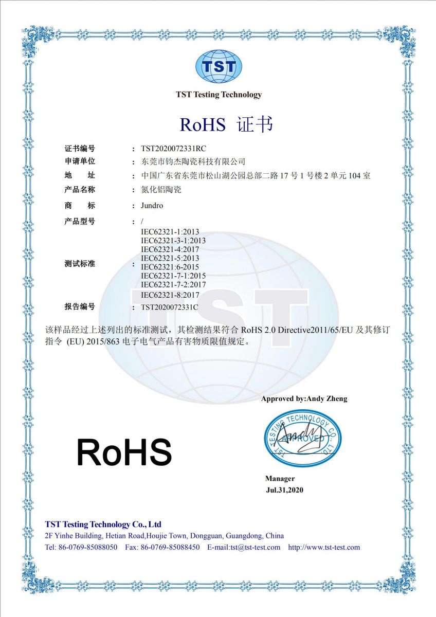鈞杰陶瓷是專業(yè)的氮化鋁陶瓷廠家,我們從事各類高精密氮化鋁陶瓷結(jié)構(gòu)件加工,我們生產(chǎn)的氮化鋁陶瓷完全符合國(guó)家環(huán)保要求,并通過ROHS檢測(cè)。